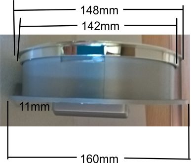 Overall bezel diameter is 148mm with a depth of 38mm, hole size 142mm. Battery compartment extends 11mm from back of clock