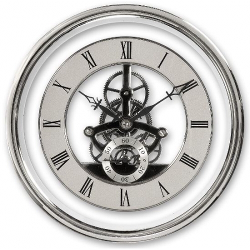 Skeleton clock movements with visible moving gears and separate lower seconds hand dial.